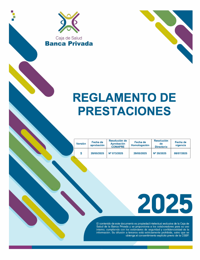 Estimado Asegurado(a), con el fin de garantizar el cumplimiento de sus derechos y obligaciones, mediante una atención eficiente y de calidad, la Caja de Salud de la Banca Privada pone en conocimiento el reglamento de prestaciones ACTUALIZADO 2025.